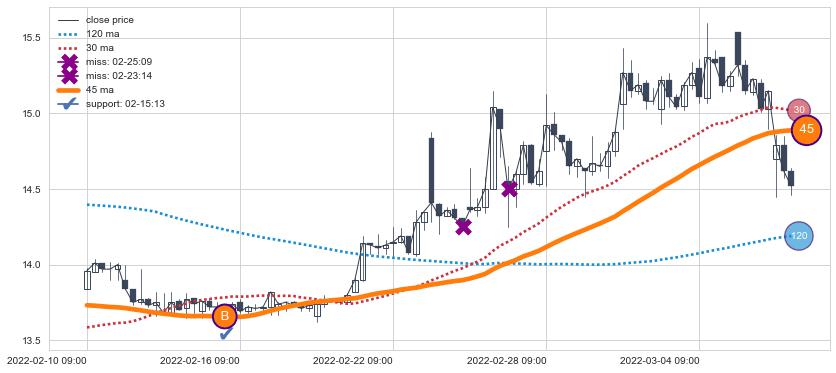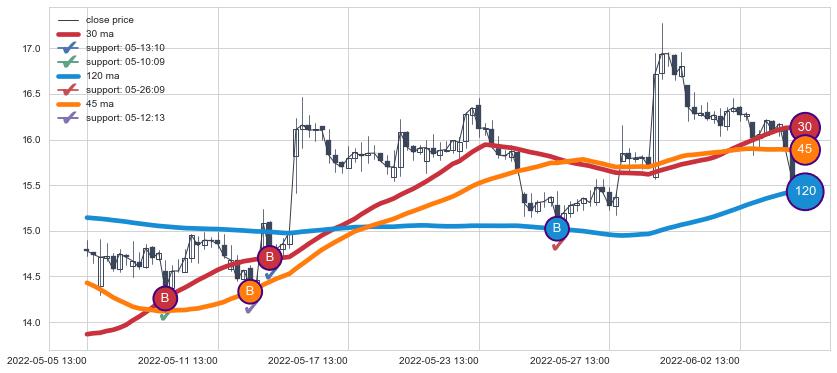 上涨趋势05-05 13:00-06-07 10:00,均线120, 45, 30确认关键支撑4处