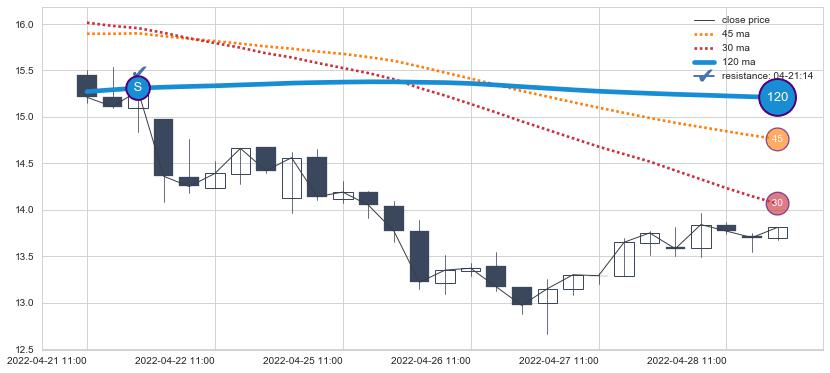 下跌趋势04-21 11:00-04-28 14:00,均线120确认关键阻力1处
