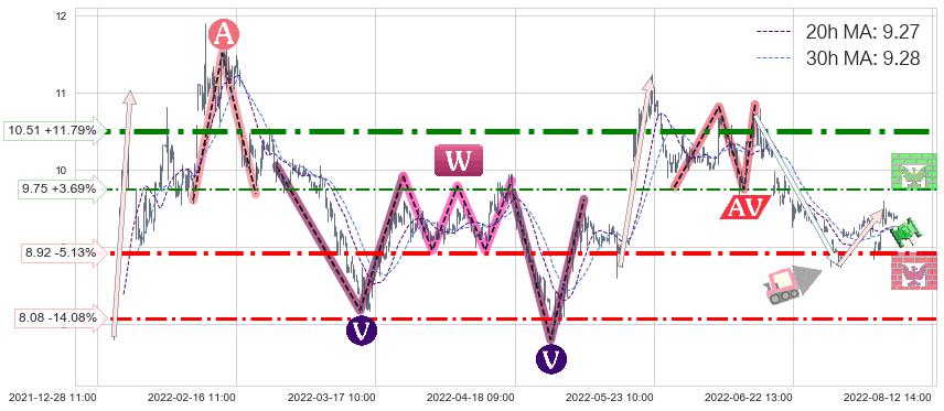 ♘ 阻力价格位9.75,可信任强度44.32%,距离最后交易2022-08-12 14:00形成的收盘价格9.40相差 +3.69%
