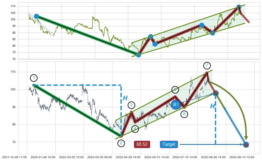 ➣ 最小中继整理涨幅→𝐇: 8.92 (上侧直角边第一阻力点②与斜边垂直距离)