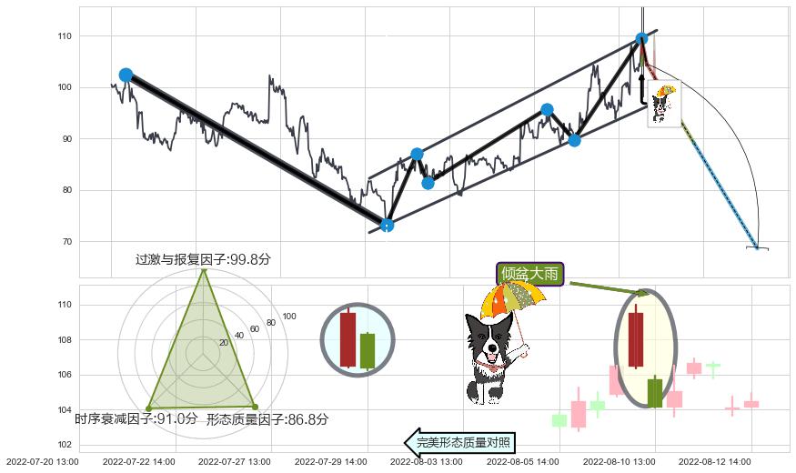 从2022-04-11 10:00至2022-08-12 14:00,共包含309个小时,阶段股价上涨39.01%,阶段股价变动位移路程比: 1 : 7,上涨趋势角度: 34.4,2022-08-01 13:00向⇪形成缺口,跳空上涨+9.07%
