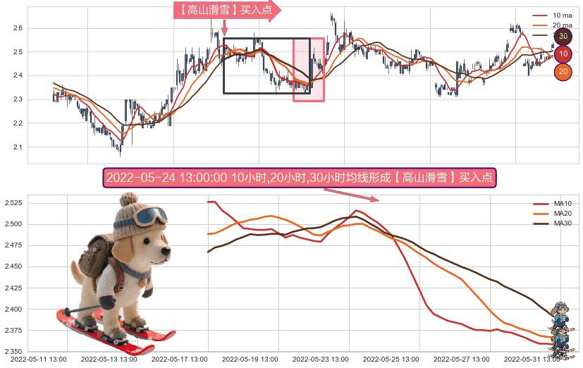 ⚀ 2022-05-17 13:00:00小时-2022-05-31 11:00:00小时显现 10小时-20小时-30小时均线 【高山滑雪】买入点 看多信号,后市看涨,买入