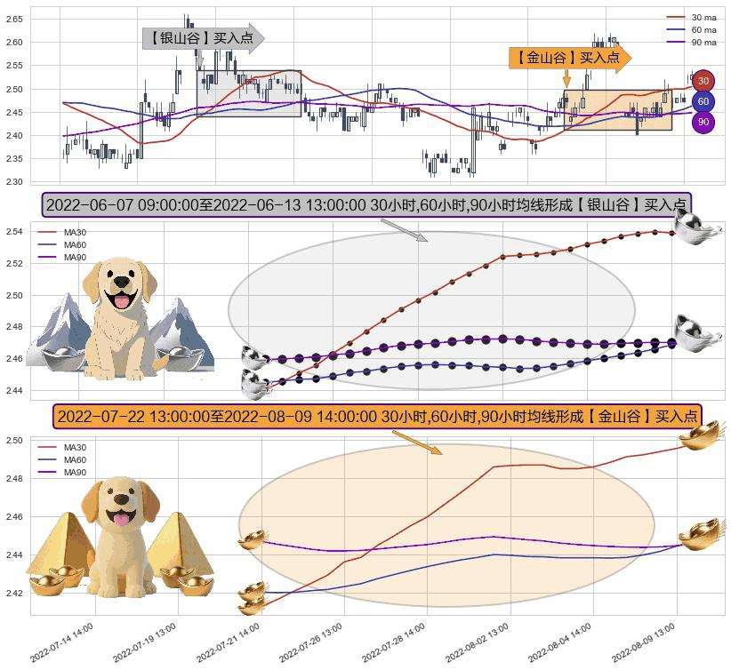 ⚃ 2022-07-22 14:00:00-小时至2022-08-09 14:00:00-小时显现 30小时-60小时-90小时均线 【金山谷】买入点 其再次确认了买入信号,可靠性更强,买入