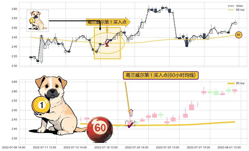 ⚀ 2022-07-19 13:00:00-小时显现 葛兰威尔均线 60小时均线 第买①入点 走势反转见底信号,后市看涨,买进信号