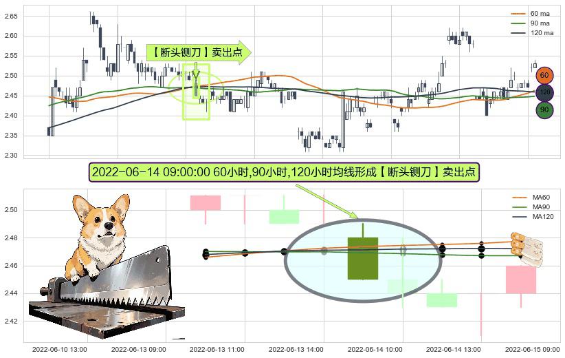 ⚀ 2022-06-14 09:00:00小时显现 60小时-90小时-120小时均线 【断头铡刀】卖出点 看空信号,后市看跌,卖出