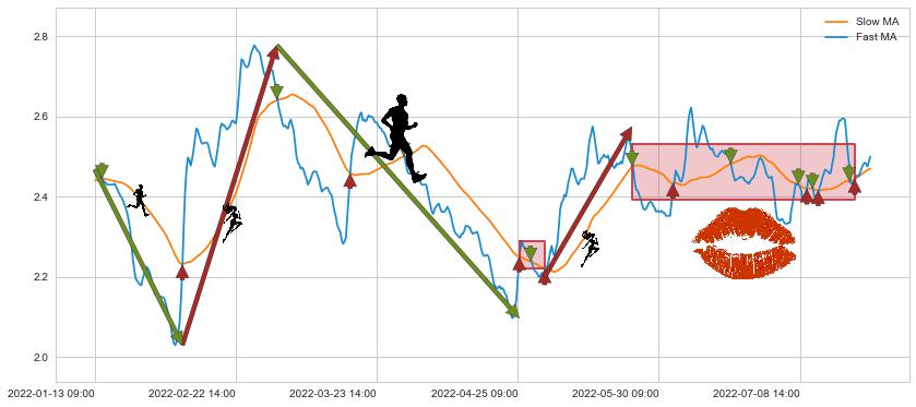 04-25 10:00至04-28 14:00 慢线与快线多次接触,存在上下穿越,有缠绕