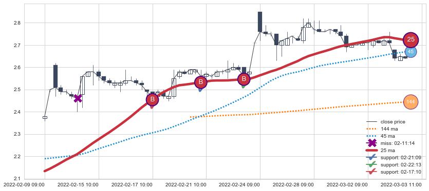 ⚅ 买点向上突破均线后,价格走势很纠结,不断在均线周围试探,有再次下探破位均线的可能
