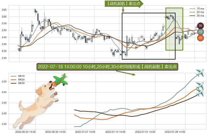 ⚀ 2022-07-04 13:00:00小时-2022-08-01 14:00:00小时显现 10小时-20小时-30小时均线 【战机起航】卖出点 看空信号,后市看跌,卖出