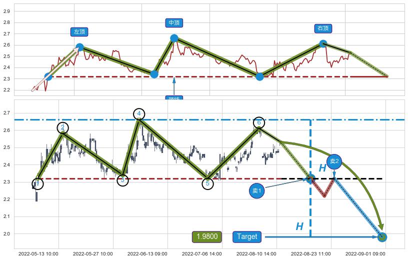 ➢ 最小反转跌幅→𝐇: 0.34000 (三重顶波峰高点到两个波谷连线的垂直距离)