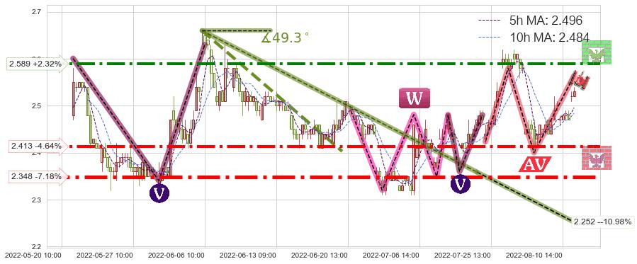 ♘ 阻力价格位2.589,可信任强度71.87%,距离最后交易2022-08-12 14:00形成的收盘价格2.530相差 +2.32%