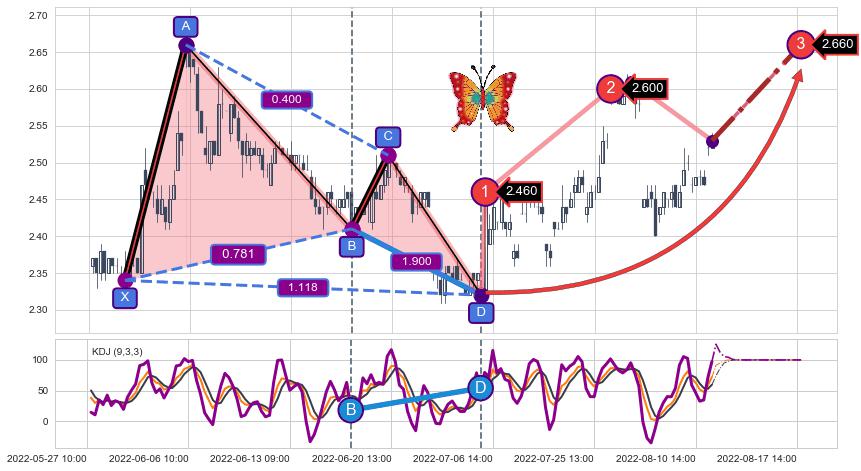 ➣ 已完成【蝴蝶】形态起点X: 05-31:09, 终点D: 07-05:13, 共89交易小时