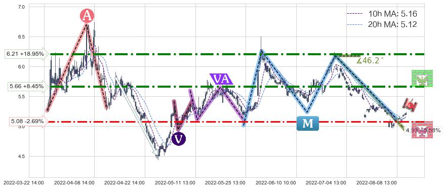 ♘ 支撑价格位5.08,可信任强度67.10%,距离最后交易2022-08-12 14:00形成的收盘价格5.22相差 -2.69%