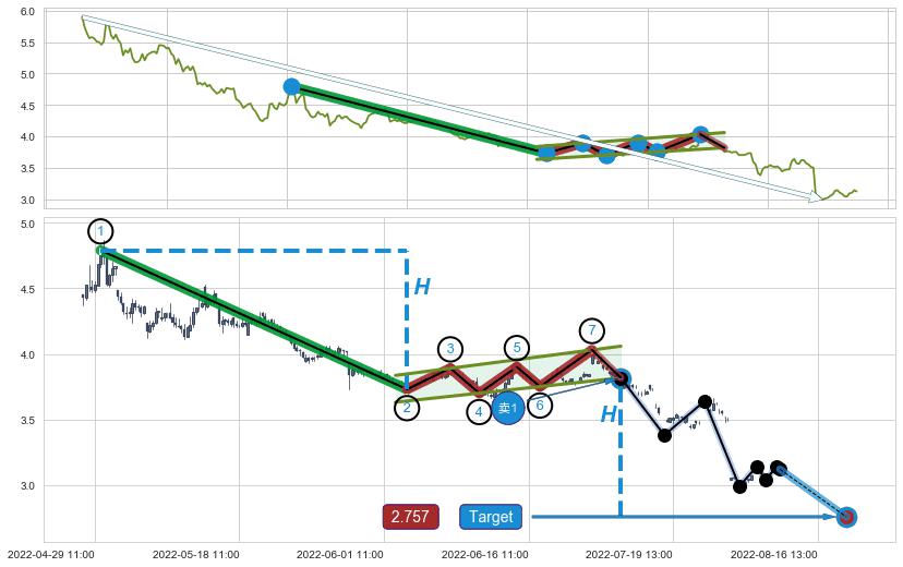 ➣ 最小中继整理跌幅→𝐇: 1.0600 (𝐇旗杆的长度:旗杆起点→顶点)