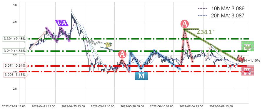 ♘ 阻力价格位3.249,可信任强度85.71%,距离最后交易2022-08-12 14:00形成的收盘价格3.100相差 +4.81%