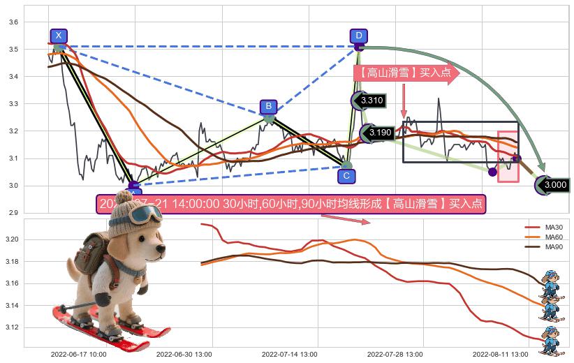 从2022-06-14 10:00至2022-06-21 13:00,共包含22个小时,阶段股价上涨3.31%,阶段股价变动位移路程比: 1 : 7