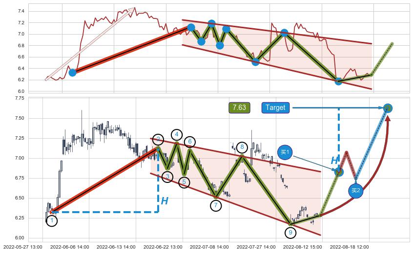 2022-06-22: 第一阻力位6.79有效抑制了下跌浪,成功阻止了价格的继续下跌。