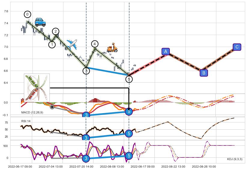 ➢ 1,3,5驱动浪MACD, RSI, KDJ走势都出现【常规背离】反转信号增强