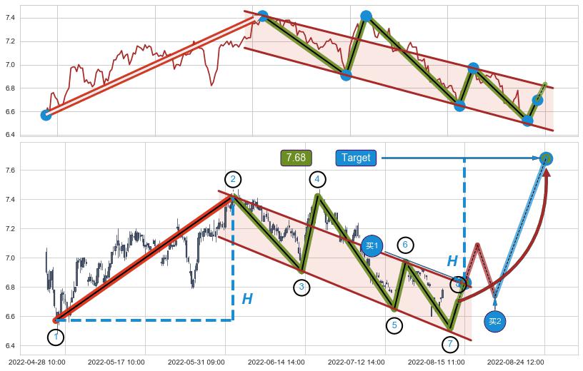 ➢ 收盘价(08-12:14: 6.70 )→再次回踩→第一根k线低点(08-09:14: 6.55 )