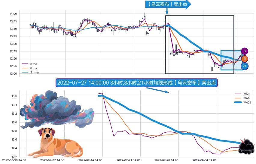 ⚀ 2022-07-14 13:00:00小时-2022-08-10 13:00:00小时显现 3小时-8小时-21小时均线 【乌云密布】卖出点 看空信号,后市看跌,卖出