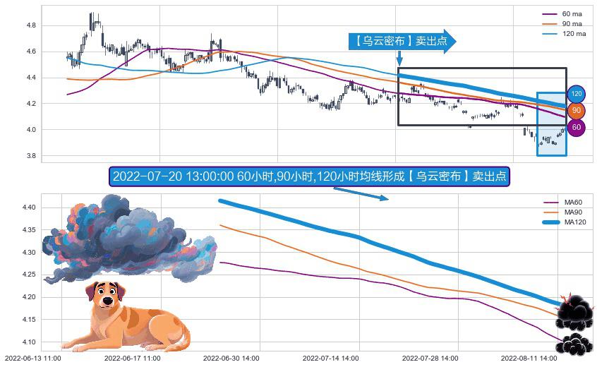 ⚀ 2022-06-24 14:00:00小时-2022-08-12 14:00:00小时显现 60小时-90小时-120小时均线 【乌云密布】卖出点 看空信号,后市看跌,卖出