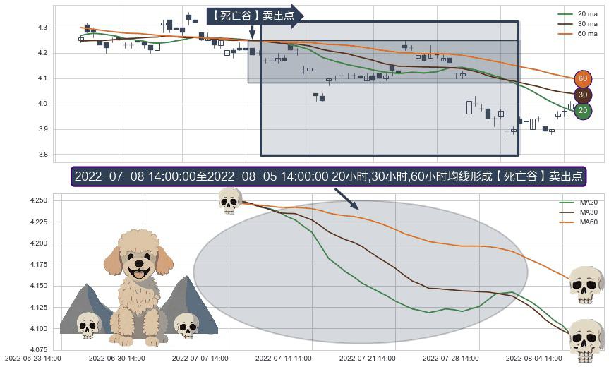 ⚀ 2022-07-11 13:00:00-小时至2022-08-05 14:00:00-小时显现 20小时-30小时-60小时均线 【死亡谷】卖出点 看空信号,后市看跌,卖出