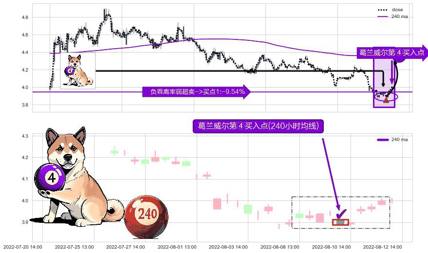 ⚀ 2022-08-10 13:00:00-小时显现 葛兰威尔均线 240小时均线 第④买入点 下降趋势均值回复的短线反弹信号,后市看涨,买进信号