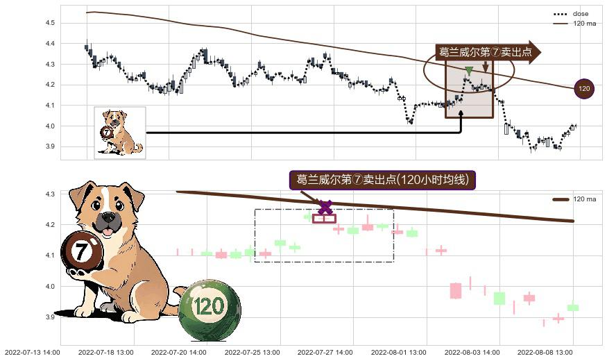 ⚀ 2022-07-26 14:00:00-小时显现 葛兰威尔均线 120小时均线 第⑦卖出点 下降趋势的中继信号,后市看跌,卖出信号