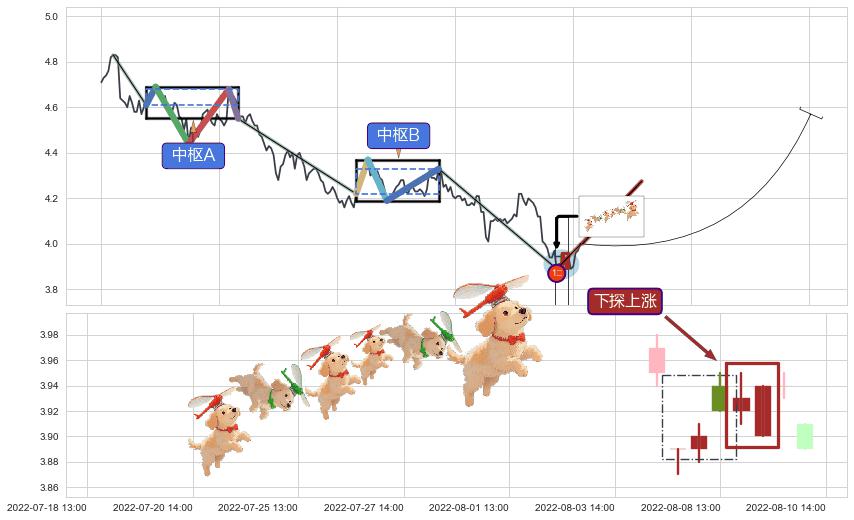 ➣ 低点影线(08-09:13: 3.900 )→回踩→第二根k线低点(08-08:13: 3.920 )