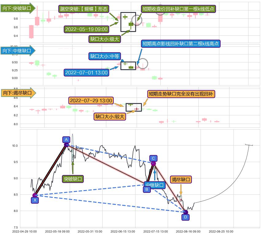➢ 突破缺口形成后,后续k已经超过14根,跳空突破【蝴蝶】形态关键点后, 出现【完全回踩】迹象,短期收盘价回补缺口第一根k线低点