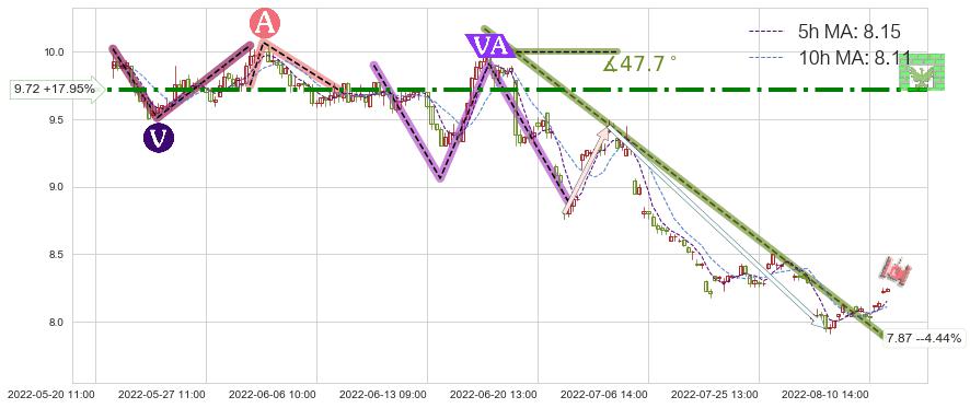 ⚔️ 2022-06-15 13:00-2022-08-12 13:00下跌趋势存在反转上涨[机会],其原下跌趋势的阻力位(7.87)已被突破[强支撑信号],原下跌趋势角度: 47.7˚