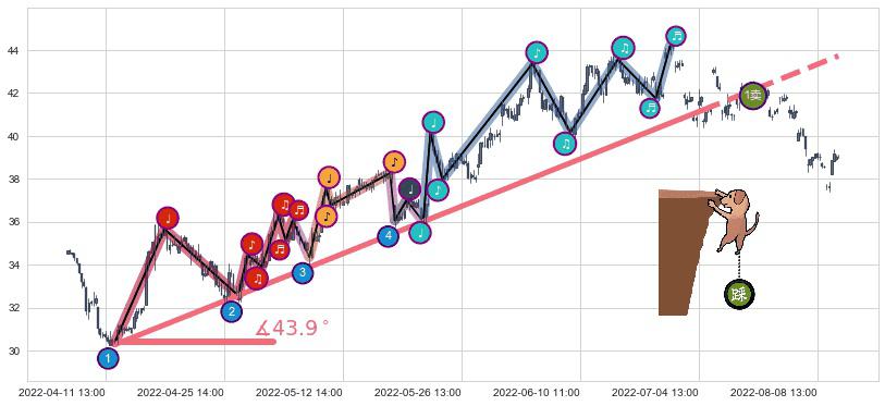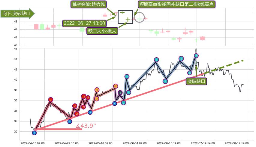 ➣ 2022-04-12 11:00-2022-07-04 14:00上升趋势存在反转[风险],其原上升趋势的支撑位(43.73)已破位[强阻力信号],原上升趋势角度: 43.9˚
