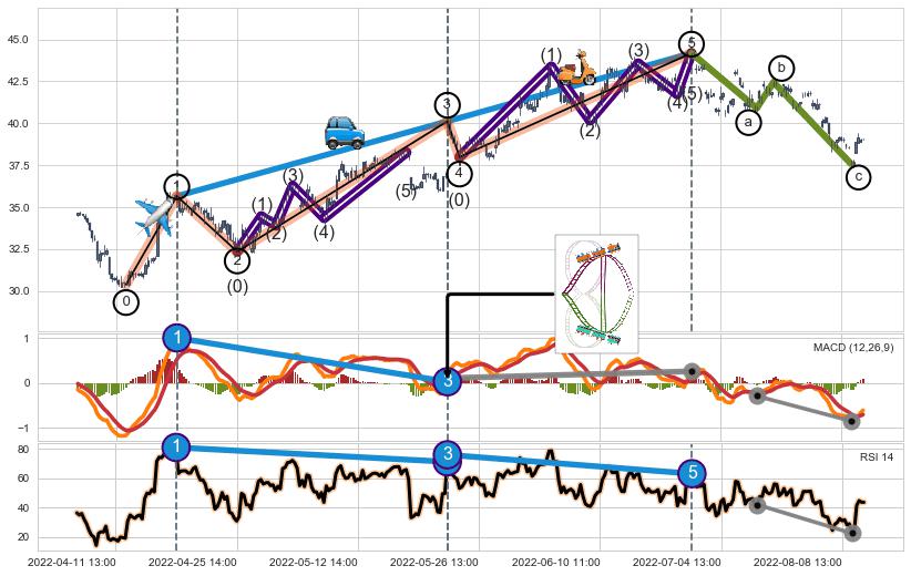 ➣ a,c调整浪MACD, RSI, KDJ走势都【未出现】背离,abc走势延续, 5浪反转概率增强