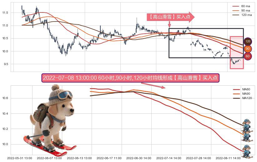 形态多维评估: ⚀ 2022-06-13 11:00:00小时-2022-08-12 14:00:00小时显现 60小时-90小时-120小时均线 【高山滑雪】买入点 看多信号,后市看涨,买入