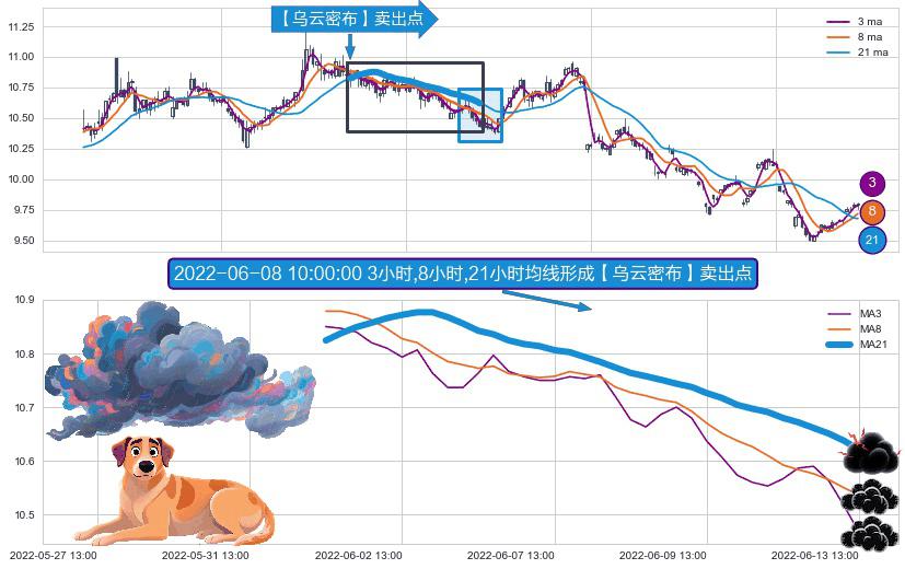 形态多维评估: ⚀ 2022-06-01 13:00:00小时-2022-06-13 13:00:00小时显现 3小时-8小时-21小时均线 【乌云密布】卖出点 看空信号,后市看跌,卖出