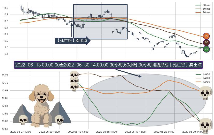 形态多维评估: ⚀ 2022-06-13 10:00:00-小时至2022-06-30 14:00:00-小时显现 30小时-60小时-90小时均线 【死亡谷】卖出点 看空信号,后市看跌,卖出