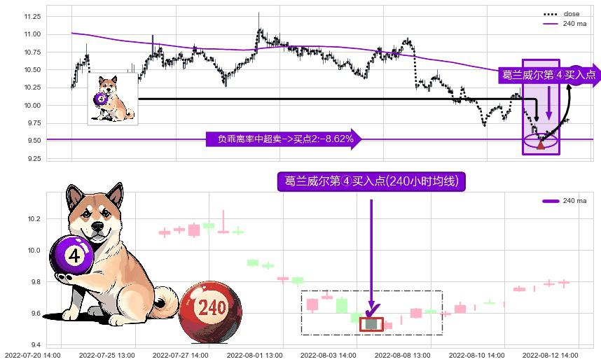 形态多维评估: ⚀ 2022-08-04 13:00:00-小时显现 葛兰威尔均线 240小时均线 第④买入点 下降趋势均值回复的短线反弹信号,后市看涨,买进信号