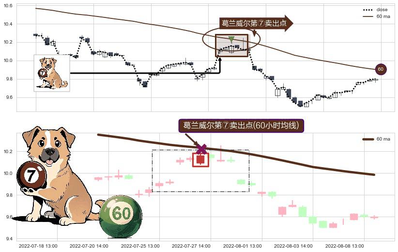 形态多维评估: ⚀ 2022-07-27 13:00:00-小时显现 葛兰威尔均线 60小时均线 第⑦卖出点 下降趋势的中继信号,后市看跌,卖出信号