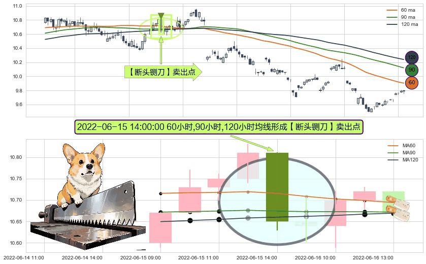 形态多维评估: ⚀ 2022-06-15 14:00:00小时显现 60小时-90小时-120小时均线 【断头铡刀】卖出点 看空信号,后市看跌,卖出