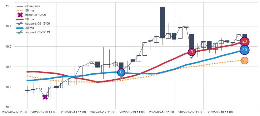 上涨趋势05-09 11:00-05-18 14:00,均线20, 30确认关键支撑2处