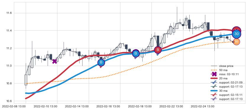 上涨趋势02-08 13:00-02-25 14:00,均线20, 30确认关键支撑3处