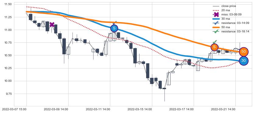 下跌趋势03-07 15:00-03-22 09:00,均线50, 30确认关键阻力2处