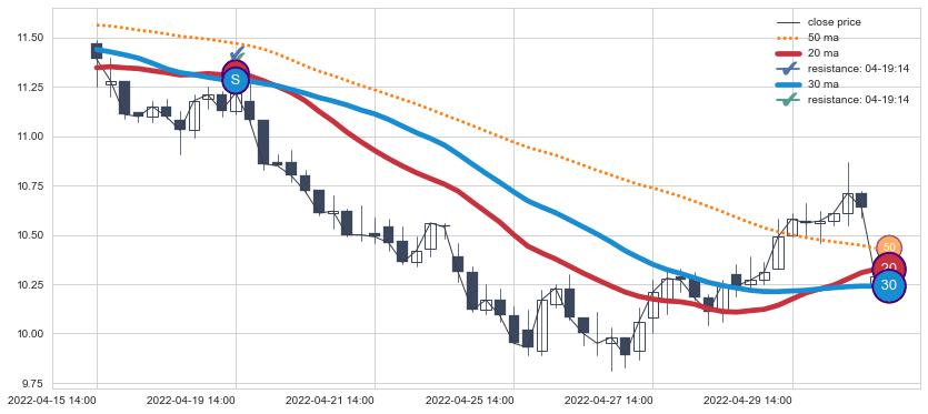 下跌趋势04-15 14:00-05-06 09:00,均线20, 30确认关键阻力1处