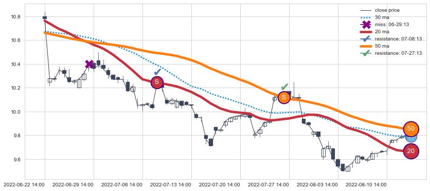 下跌趋势06-22 14:00-08-12 14:00,均线50, 20确认关键阻力2处