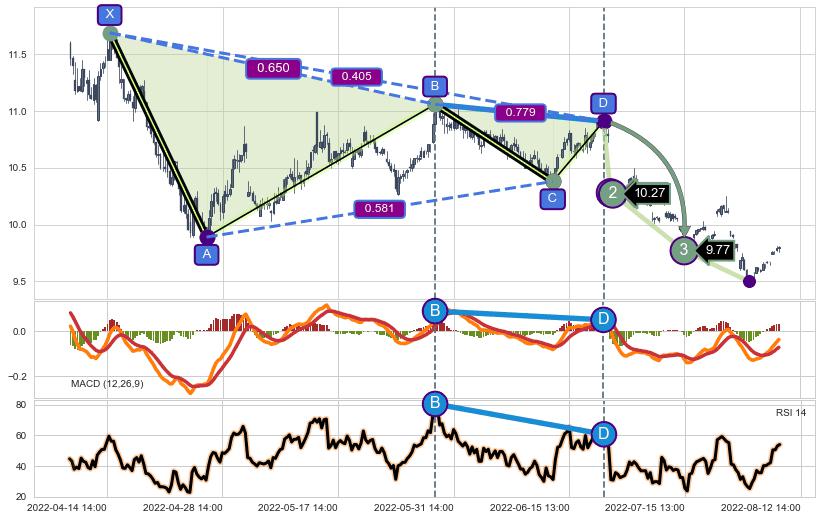 ➢ 谐波价格D点比B点高 ⤴,【MACD】指标D点比B点低 ⤵️