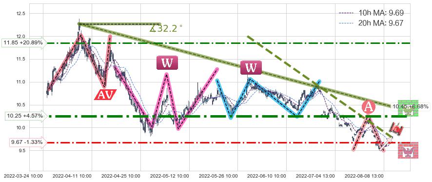 ➣ 【已确认突破】最后价格:9.80与最小【整理】第一目标价格→(08-24:12: 8.66 )相较: 下跌空间【中等】