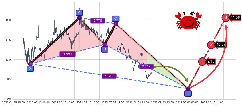 ➢ 距离预测D点位置尚有下跌空间,短线依然【看跌】, 耐心等待看涨【螃蟹】形态反转启动