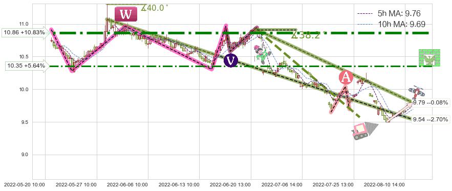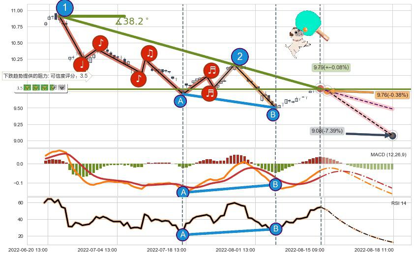 ➢ 预测:2022-08-15 10:00,【试探阻力】稳定目前下跌趋势的前提下,预测价格:9.76