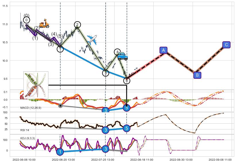➢ 1,3,5驱动浪MACD, RSI, KDJ走势都出现【常规背离】反转信号增强