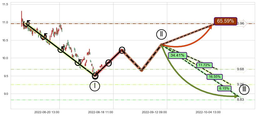 ➢ 循环浪继续向下【最高】位置(10-03:13, 9.68),匹配聚类样本比例34.05%, 可能性概率11.72%