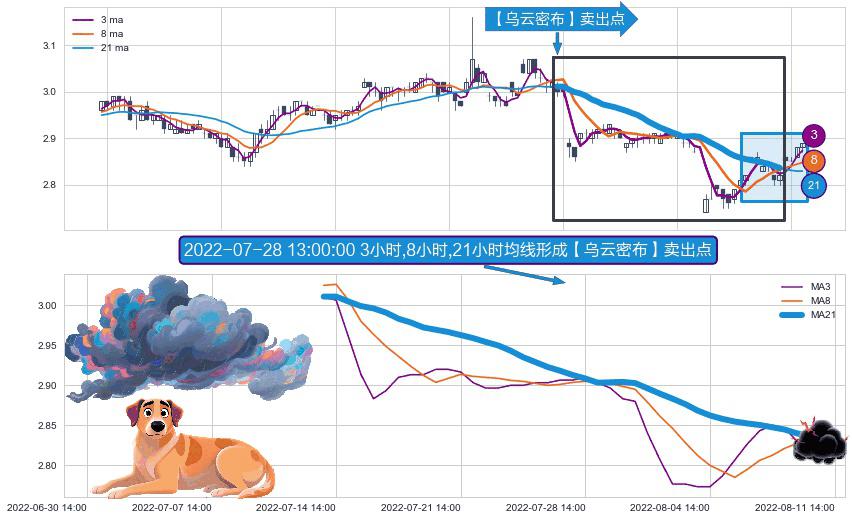 ⚀ 2022-07-14 13:00:00小时-2022-08-10 14:00:00小时显现 3小时-8小时-21小时均线 【乌云密布】卖出点 看空信号,后市看跌,卖出